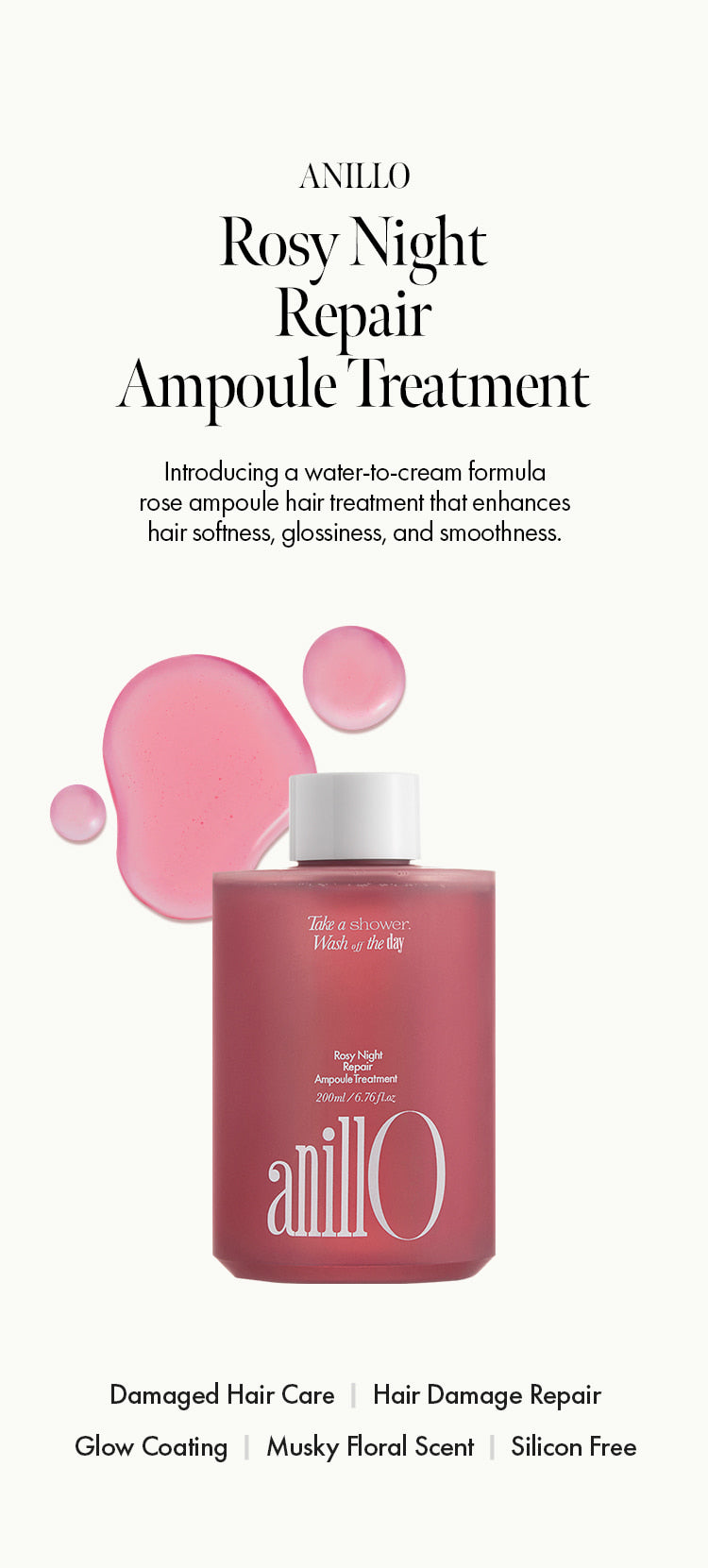 The ANILLO Rosy Night Repair Ampoule Treatment 200ml is an intensive, salon-grade repair formula designed to revive severely damaged, dry or chemically treated hair. Concentrated with a multi-peptide complex (Copper Tripeptide-1, Acetyl Hexapeptide-8, Palmitoyl Peptide series), it targets internal keratin bond damage to improve elasticity, strength and overall fibre cohesion. A nourishing blend of ceramide NP, rosehip (Rosa Canina) oil, camellia seed oil and moringa seed oil replenishes the lipid layer, smooths cuticle edges and boosts shine. With its ampoule-like texture, the formula melts into hair, delivering fast-absorbing moisture and long-lasting softness without heaviness. Rosa Damascena extract and botanical soothing agents help condition the scalp and hair surface, while the signature rosy-musky scent elevates the experience into a comforting night-care ritual.