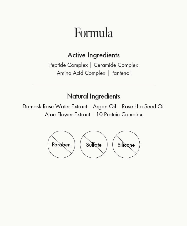 Water (Aqua), Cetearyl Alcohol, Behentrimonium Chloride, Cetyl Alcohol, Stearamidopropyl Dimethylamine, Dimethicone, Cyclopentasiloxane, Cyclohexasiloxane, Rosa Canina Fruit Oil, Camellia Japonica Seed Oil, Moringa Oleifera Seed Oil, Hippophae Rhamnoides Oil, Argania Spinosa Kernel Oil, Simmondsia Chinensis (Jojoba) Seed Oil, Prunus Persica (Peach) Kernel Oil, Panthenol, Allantoin, Ceramide NP, Copper Tripeptide-1, Acetyl Hexapeptide-8, Palmitoyl Pentapeptide-4, Palmitoyl Tetrapeptide-7, Palmitoyl Tripeptide-1, Rosa Damascena Extract, Centella Asiatica Extract, Euterpe Oleracea Fruit Extract, Equisetum Arvense Extract, 1,2-Hexanediol, Butylene Glycol, Glycerin, Propanediol, Hydroxyethylcellulose, Polyquaternium-10, Hydroxypropyl Guar Hydroxypropyltrimonium Chloride, Citric Acid, Fragrance (Parfum), Linalool, Citronellol, Geraniol, Coumarin, Alpha-Isomethyl Ionone, Hydroxycitronellal, Limonene.